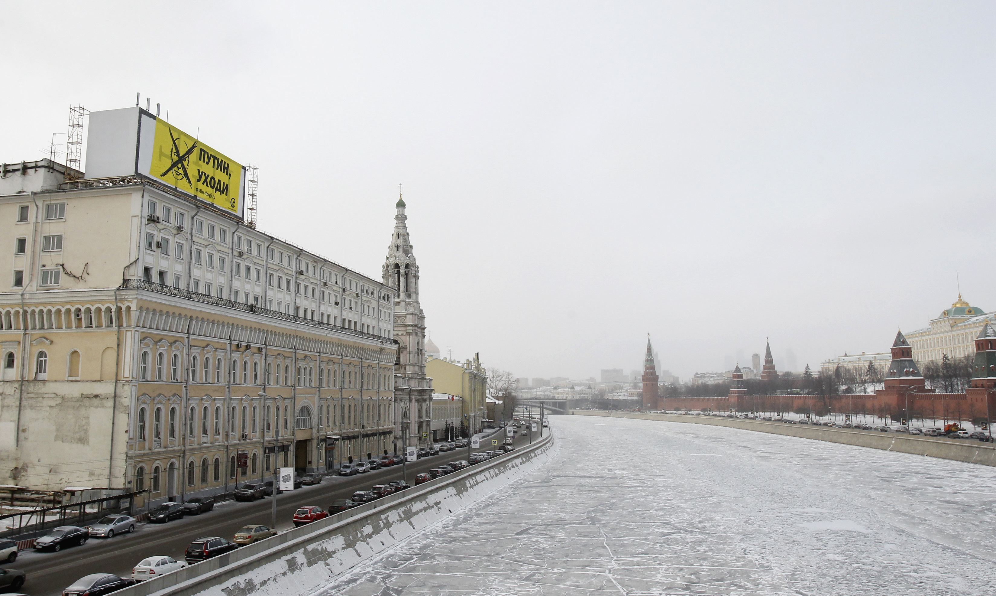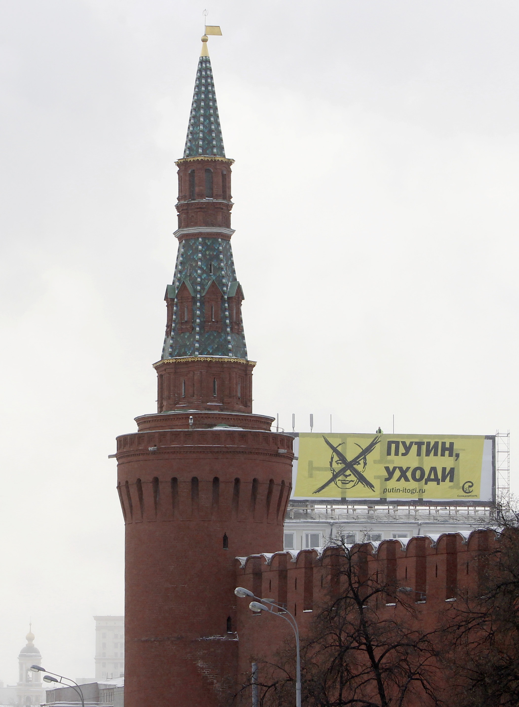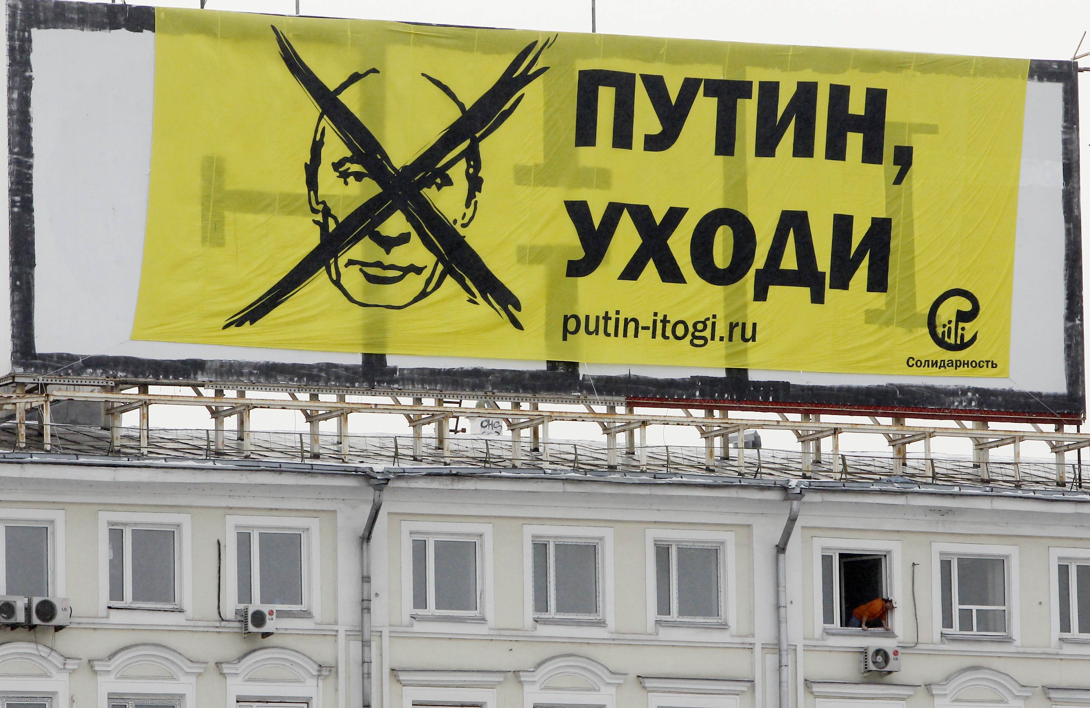 Μέλη της Solidarnost, της αντιπολιτευόμενης «Αλληλεγγύης» κρέμασαν ένα τεράστιο πανό σε κτήριο απέναντι από το Κρεμλίνο, στέλνοντας ένα βροντερό μήνυμα στον πρωθυπουργό και υποψήφιο για την προεδρία Βλαντιμίρ Πούτιν.