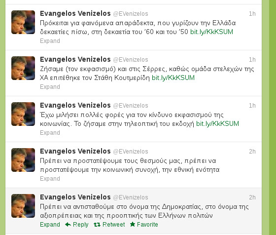 «Πρέπει να αντισταθούμε στο όνομα της Δημοκρατίας, στο όνομα της αξιοπρέπειας και της προοπτικής των Ελλήνων πολιτών», έγραψε στο twitter μετά την επίθεση του Ηλία Κασιδιάρη στις κυρίες Λιάνα Κανέλλη και Λένα Δούρου.«Πρέπει να προστατέψουμε τους θεσμούς μας, πρέπει να προστατέψουμε την κοινωνική συνοχή, την εθνική ενότητα», συνέχισε.