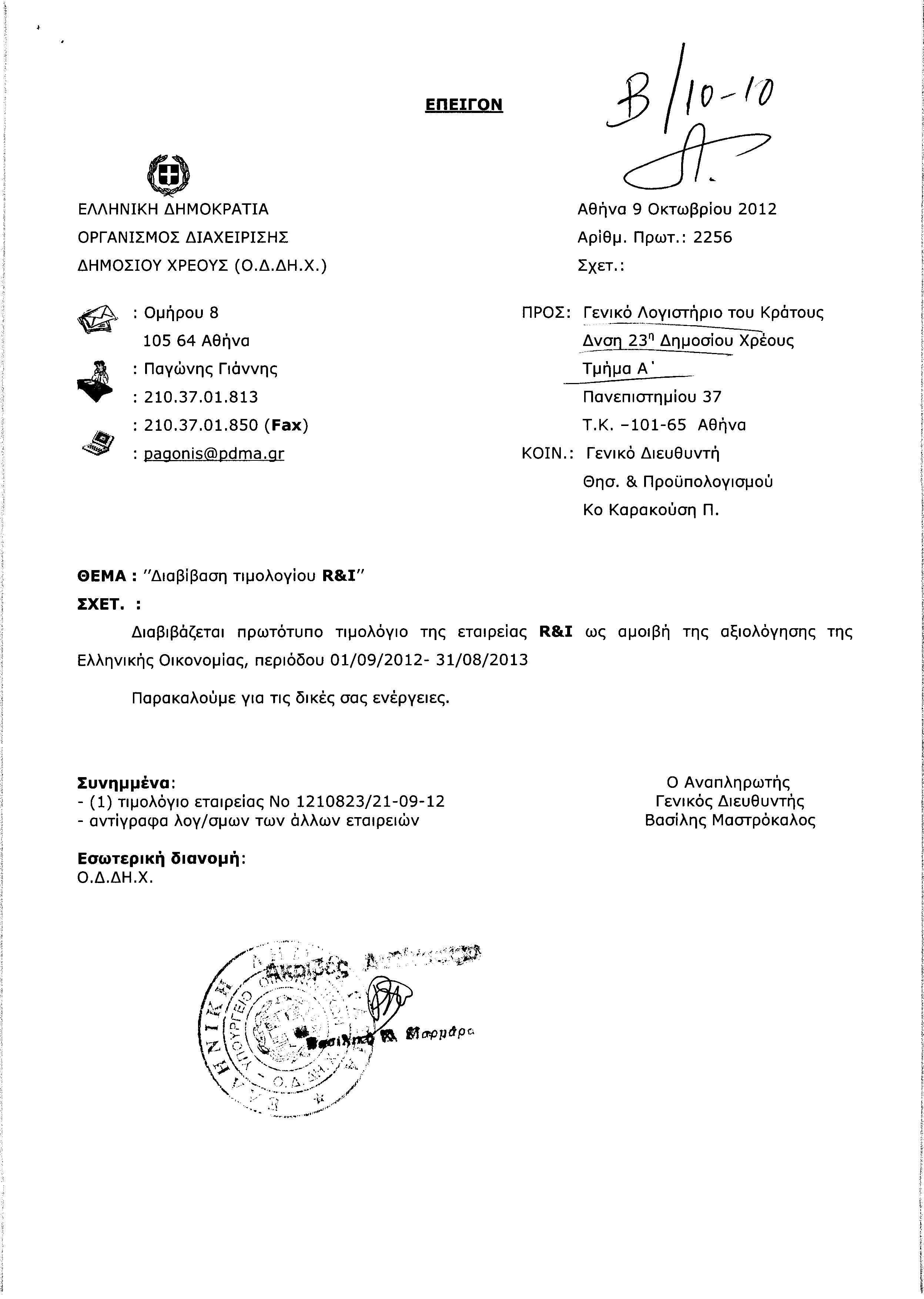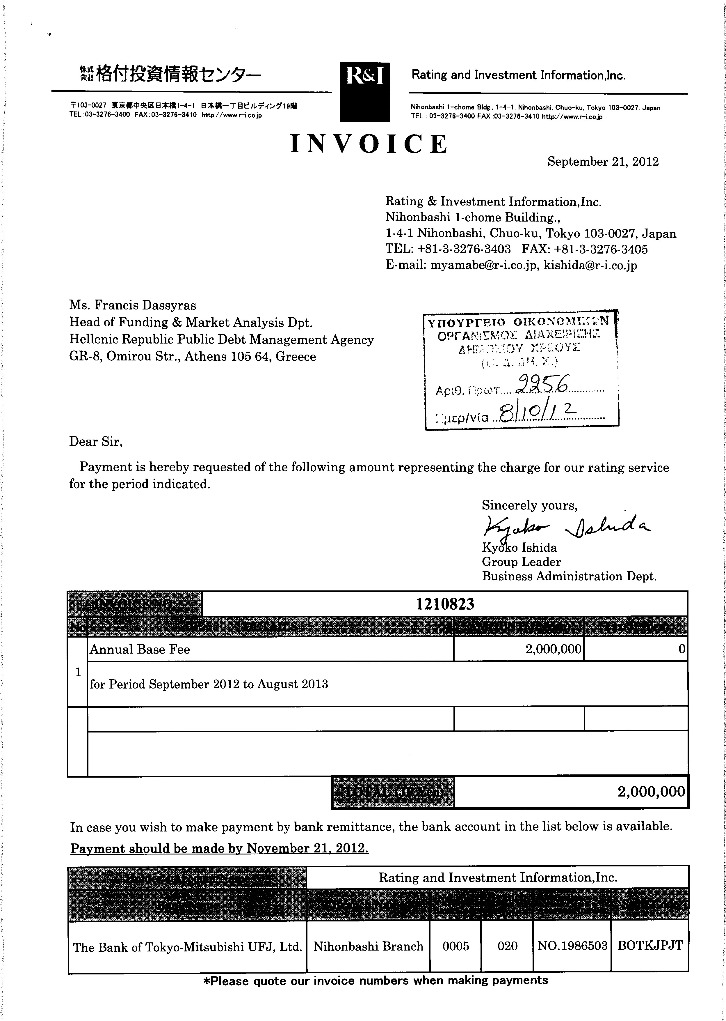 Δείτε παρακάτω το πρώτο έγγραφο, το οποίο είναι το τιμολόγιο του ιαπωνικού οίκου αξιολόγησης R&I, ύψους 2 εκατ. Ευρώ, ως αμοιβή της για την αξιολόγηση της Ελληνικής Οικονομίας, την περίοδο από το Σεπτέμβριο του 2012 έως και τον Αύγουστο του 2013.